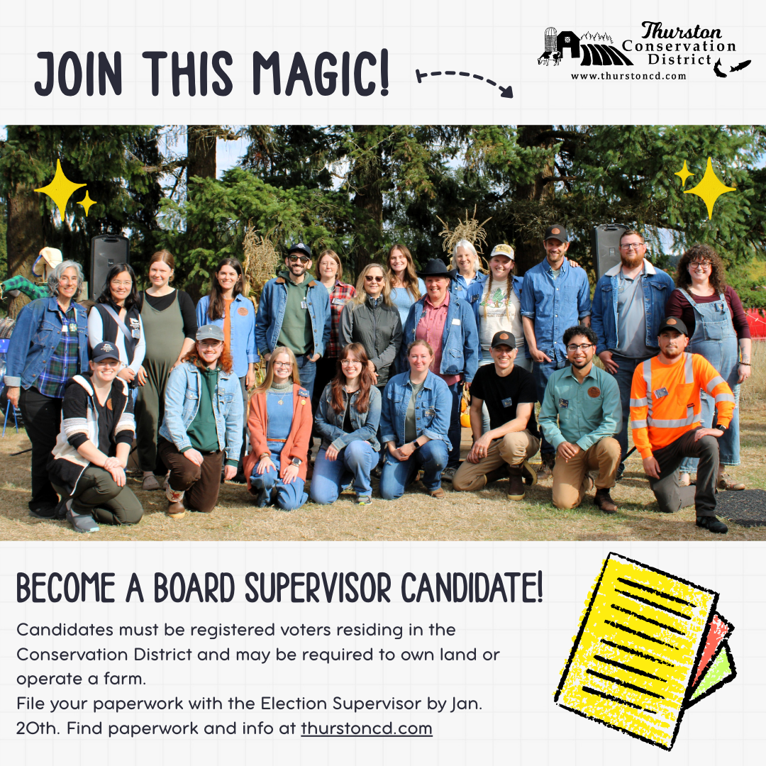 Graphic advertising the opportunity to become a board supervisor candidate. Visit https://thurstoncd.com/about-us/board-member-elections/ to learn more.